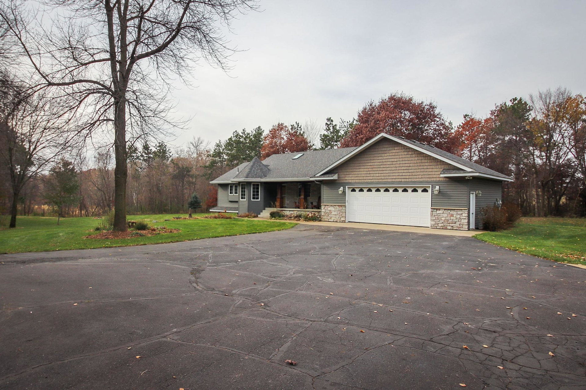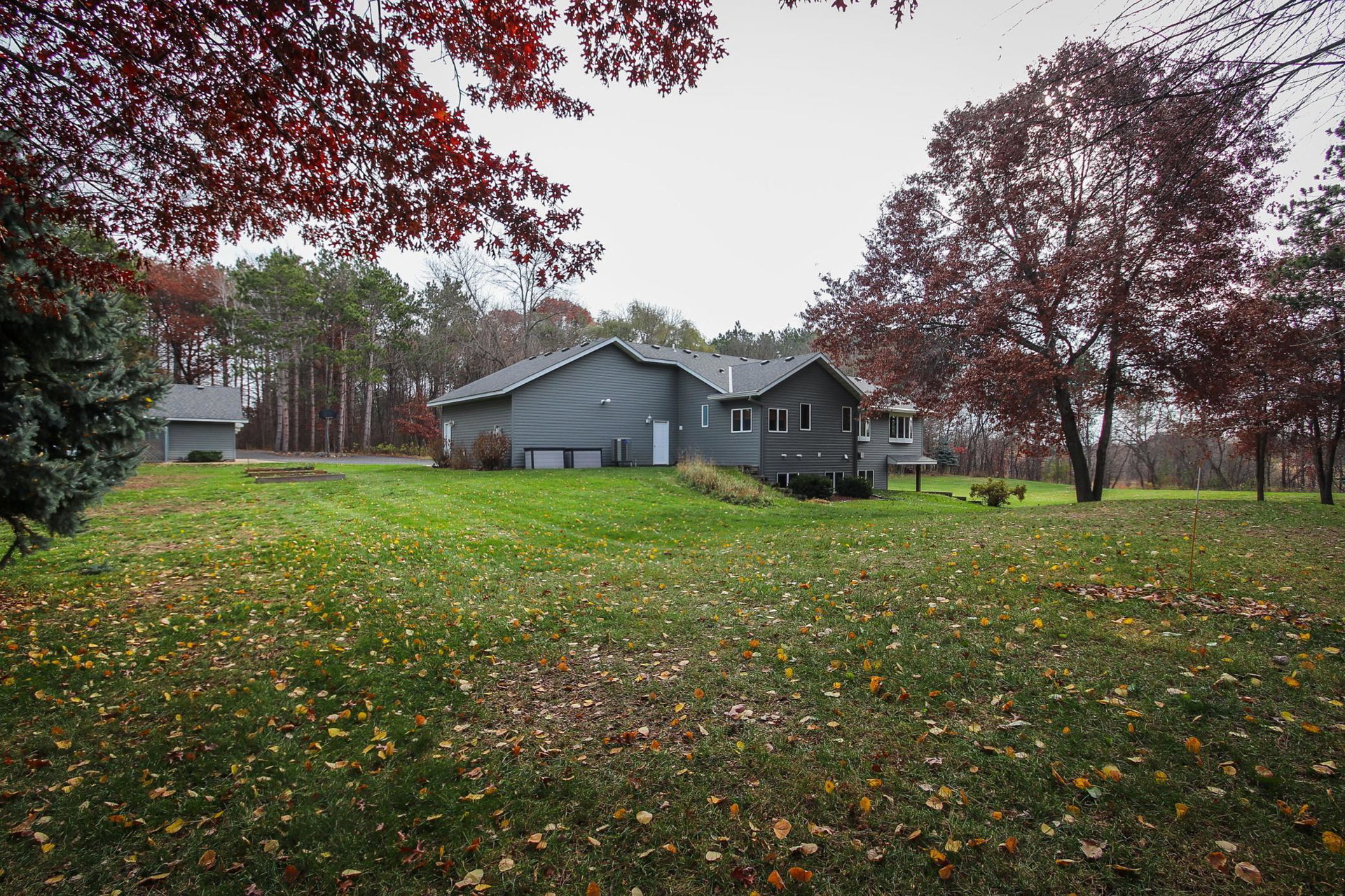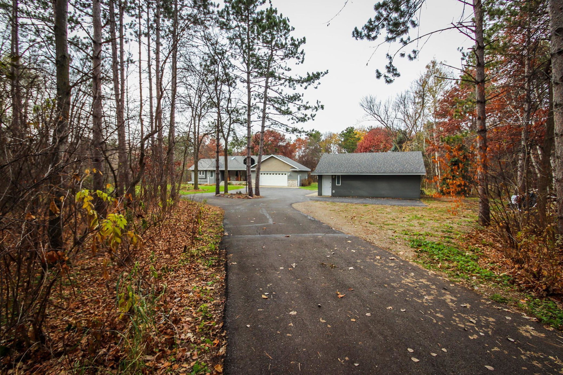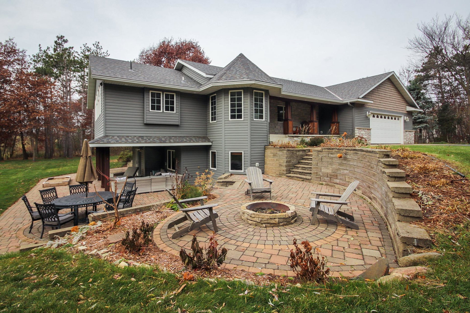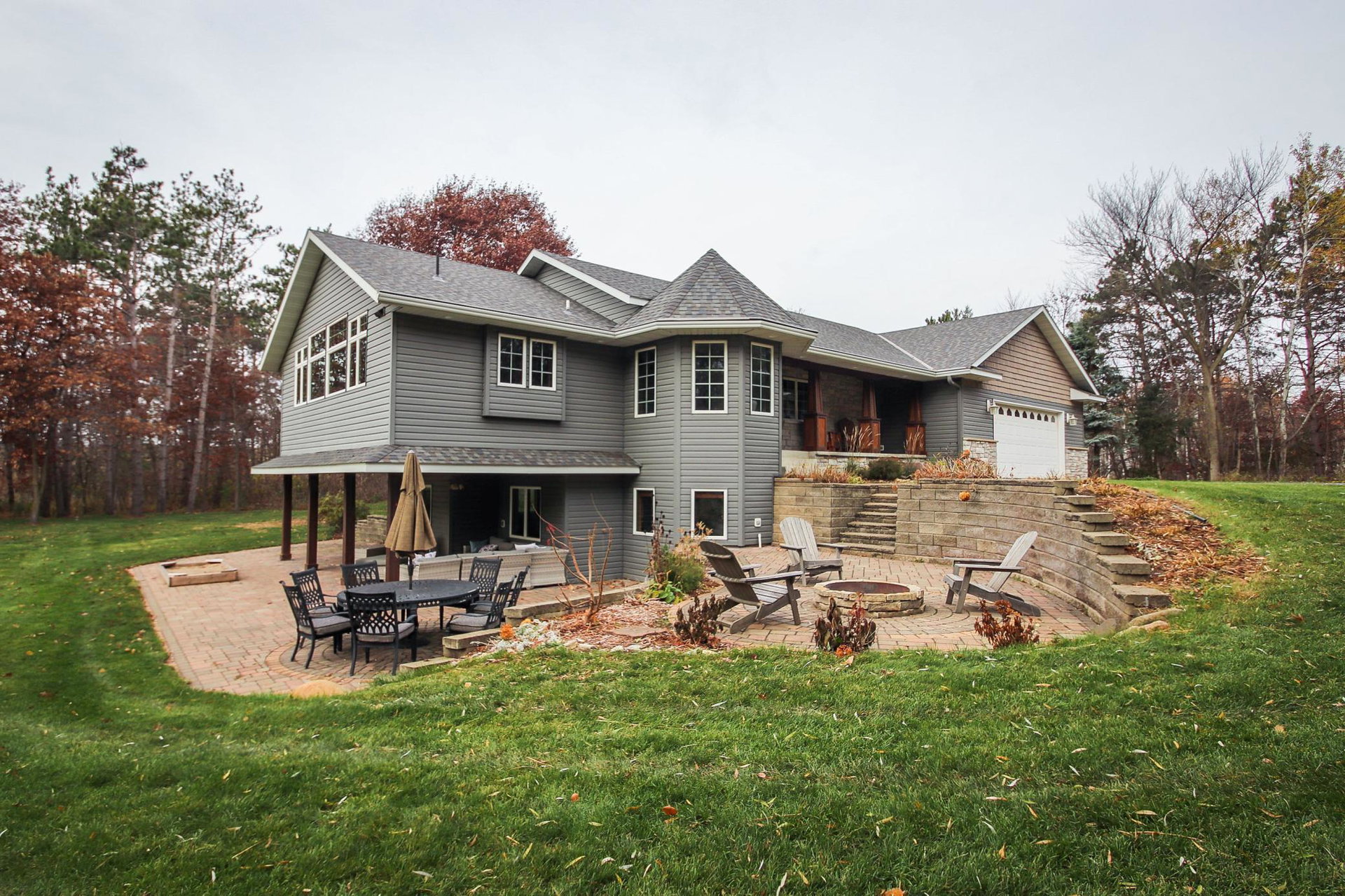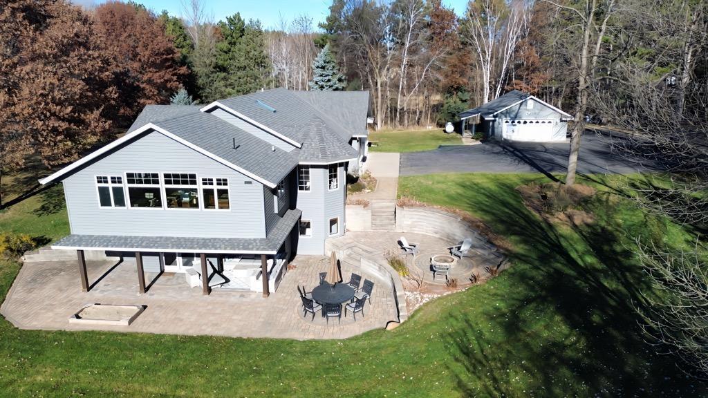 Absolutely stunning property on a 3.7 acre secluded lot, surrounded by woods, rolling hills & abundance of wildlife. The home has countless recent updates featuring a beautiful dream kitchen, stainless steel appliances, granite counter tops, tiled floors, center island, breakfast bar, vaulted ceilings, panel doors, see through glass fireplace, built-in entry lockers and huge windows throughout showcasing the amazing exterior views. Main level primary bedroom with private bath and laundry accommodates one level living. The lower level is a walkout onto impressive wrap around patio with firepit, extensive landscaping and perfect for entertaining. Endless room for storage and hobbies in the attached and detached finished and heated garages/shop. Newer shingles, furnace, AC, heat pump, steel siding, flooring, fixtures, paint and more you have to see to appreciate the enjoyment the peacefulness this home offers!
